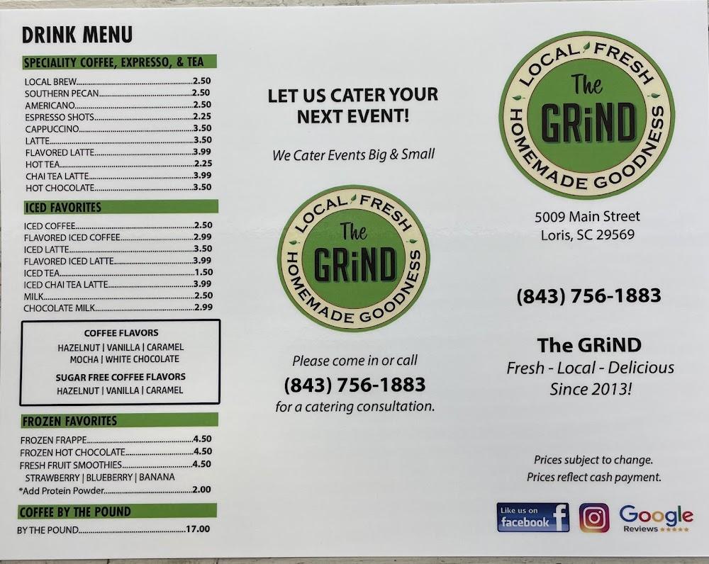 Welcome to The Grind, a family-run restaurant in Loris, SC, since 2013. We take pride in serving homemade soups, salads, and sandwiches crafted from farm-fresh, locally grown ingredients. Our vibrant menu highlights delicious vegetarian options and features a full coffee bar offering hot, iced, and frozen coffee, alongside refreshing fruit smoothies and frappes made with locally roasted beans. Enjoy a meal on our patio, take advantage of our drive-thru service, or dine in for a cozy experience. With quick service and exceptional desserts, The Grind is perfect for breakfast, lunch, or dinner. Join us for a taste of local goodness!