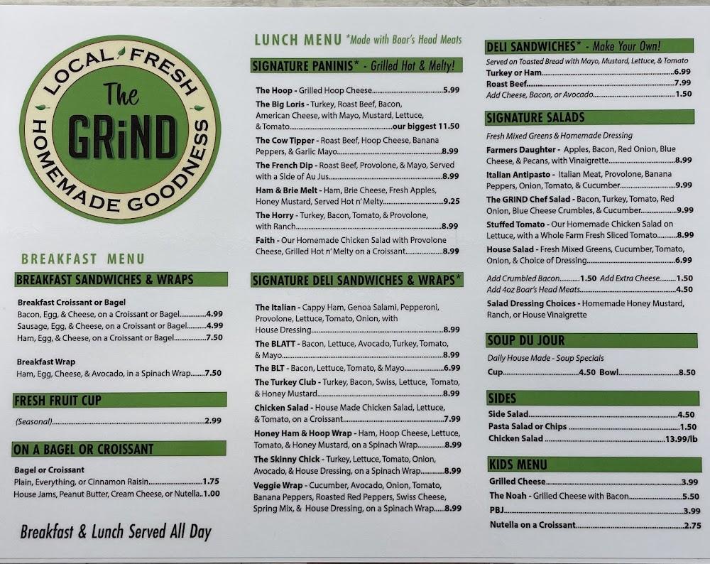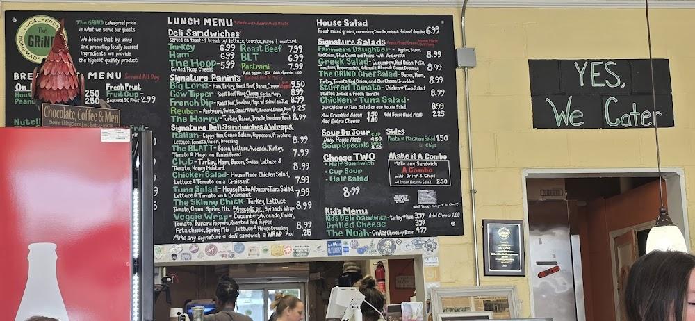 The menu at The Grind features a delightful range of comfort foods. Breakfast items include signature sandwiches and the popular 'Cow Tipper'. The lunch menu showcases deli sandwiches, special paninis, and salads that cater to various tastes. Daily soup specials add warmth and variety to the dining experience. The Grind also embraces vegetarian and vegan options, ensuring everyone finds something to enjoy. Desserts round off meals nicely, while the coffee bar offers beverages to keep you energized.